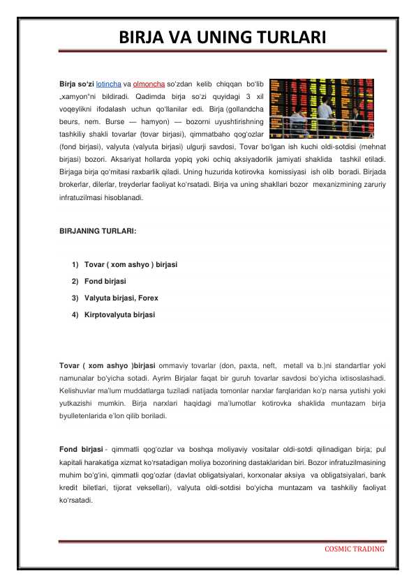 TaqdimotlarKurs ishlariMustaqil ishlarDiplom ishlariBlankalarBiznes rejalarElektron kitoblarStatistikaMaqolaPlakatlarLoyihalarIjodiy IshlarAmaliy ishlarDasturlash tillariNamunaviy hujjatlarO'quv qo'llanmalarTarqatma materiallarDars ishlanmalarTestlarReferatlarIxtiro patentiDissertatsiya ishlariLabaratoriya Ishlari