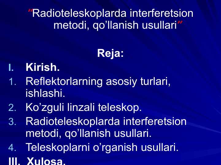 Radioteleskoplarda interferetsion metodi, qo’llanish usullari