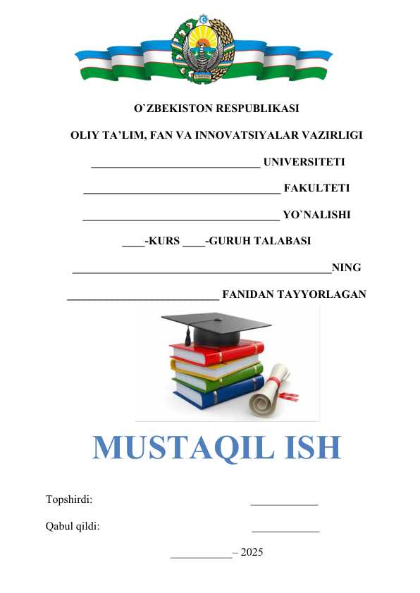 TaqdimotlarKurs ishlariMustaqil ishlarDiplom ishlariBlankalarBiznes rejalarElektron kitoblarStatistikaMaqolaPlakatlarLoyihalarIjodiy IshlarAmaliy ishlarDasturlash tillariNamunaviy hujjatlarO'quv qo'llanmalarTarqatma materiallarDars ishlanmalarTestlarReferatlarIxtiro patentiDissertatsiya ishlariLabaratoriya Ishlari