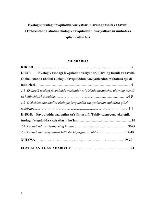 Ekologik tusdagi favqulodda vaziyatlar, ularning tasnifi va tavsifi. O’zbеkistonda aholini ekologik favquloddan vaziyatlardan muhofaza qilish tadbirlari