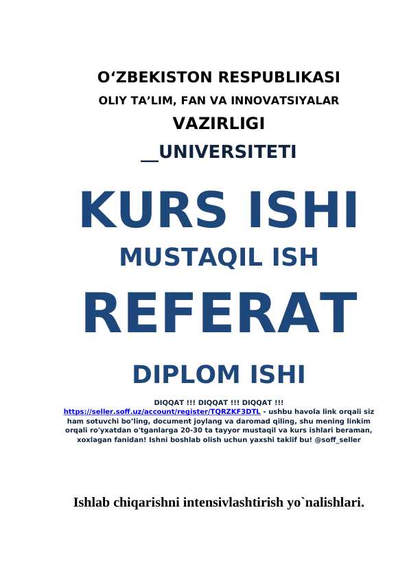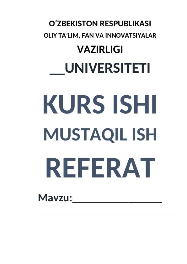 TaqdimotlarKurs ishlariMustaqil ishlarDiplom ishlariBlankalarBiznes rejalarElektron kitoblarStatistikaMaqolaPlakatlarLoyihalarIjodiy IshlarAmaliy ishlarDasturlash tillariNamunaviy hujjatlarO'quv qo'llanmalarTarqatma materiallarDars ishlanmalarTestlarReferatlarIxtiro patentiDissertatsiya ishlariLabaratoriya Ishlari