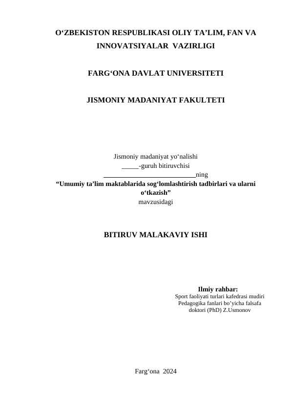 MAKTAB O‘QUVCHILARIDA JISMONIY TARBIYA JARAYONI SOG‘LOM TURMUSH TARZINI SHAKLLANTIRISH BITIRUV MALAKAVIY ISH BMI