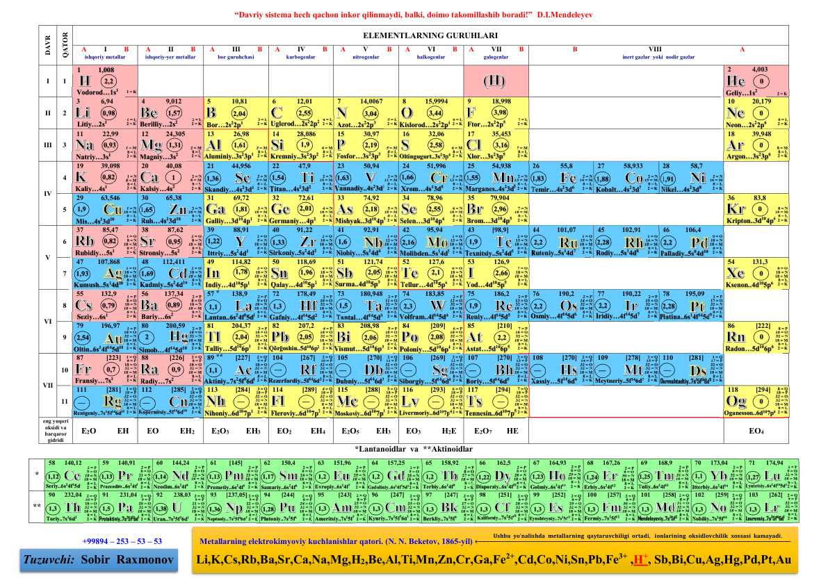 Davriy sistema D.I.Mendeleyev UZB 2025 yangi