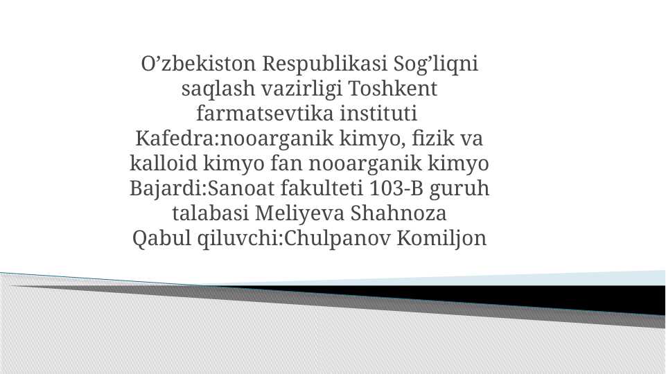 TaqdimotlarKurs ishlariMustaqil ishlarDiplom ishlariBlankalarBiznes rejalarElektron kitoblarStatistikaMaqolaPlakatlarLoyihalarIjodiy IshlarAmaliy ishlarDasturlash tillariNamunaviy hujjatlarO'quv qo'llanmalarTarqatma materiallarDars ishlanmalarTestlarReferatlarIxtiro patentiDissertatsiya ishlariLabaratoriya Ishlari