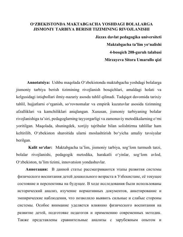 maqola O‘ZBEKISTONDA MAKTABGACHA YOSHDAGI BOLALARGA JISMONIY TARBIYA BERISH TIZIMINING RIVOJLANISHI