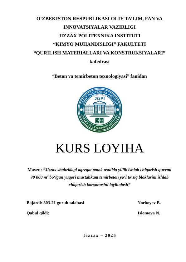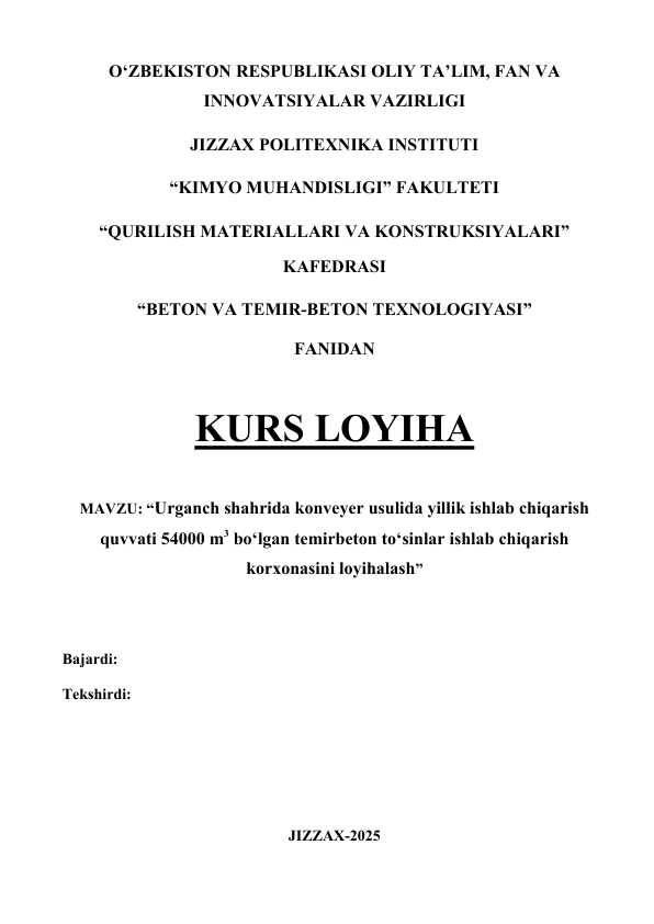 Urganch shahrida konveyer usulida yillik ishlab chiqarish quvvati 54000 m3 bo‘lgan temirbeton to‘sinlar ishlab chiqarish korxonasini loyihalash