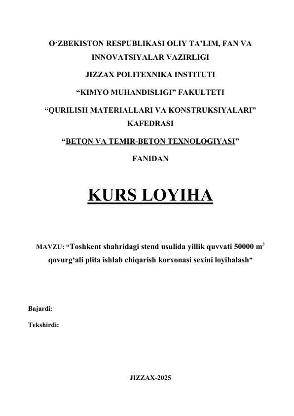 Toshkent shahridagi stend usulida yillik quvvati 50000 m3 qovurg‘ali plita ishlab chiqarish korxonasi sexini loyihalash