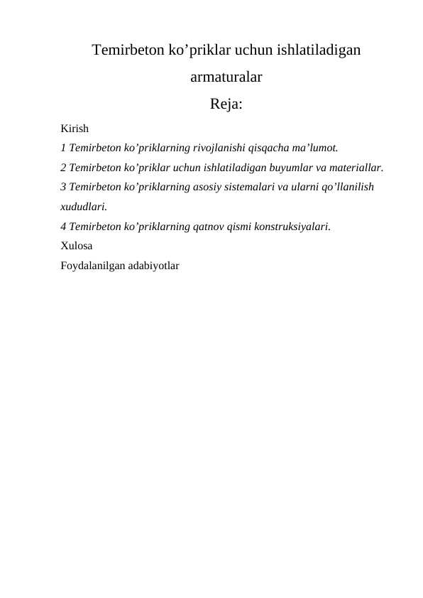 TaqdimotlarKurs ishlariMustaqil ishlarDiplom ishlariBlankalarBiznes rejalarElektron kitoblarStatistikaMaqolaPlakatlarLoyihalarIjodiy IshlarAmaliy ishlarDasturlash tillariNamunaviy hujjatlarO'quv qo'llanmalarTarqatma materiallarDars ishlanmalarTestlarReferatlarIxtiro patentiDissertatsiya ishlariLabaratoriya Ishlari