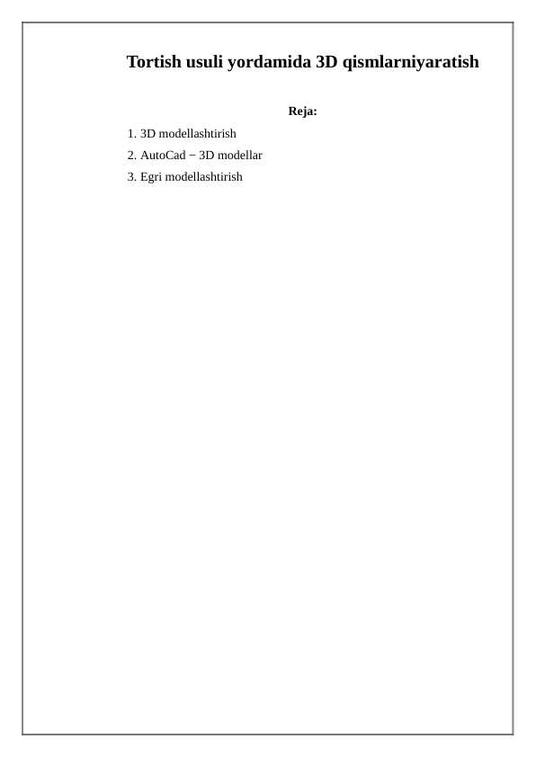 Modellashtirish asboblar panellaridagi barcha buyruqlarni misollar yordamida o‘zlashtirish.