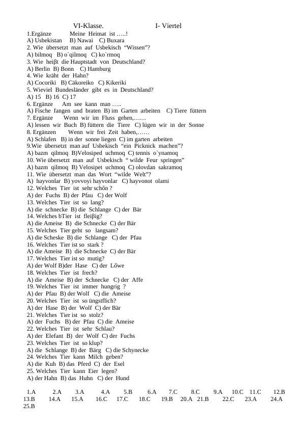 5-Klasse / Vierteltest für Deutsch / Nemis tili fani uchun chorak test savollari