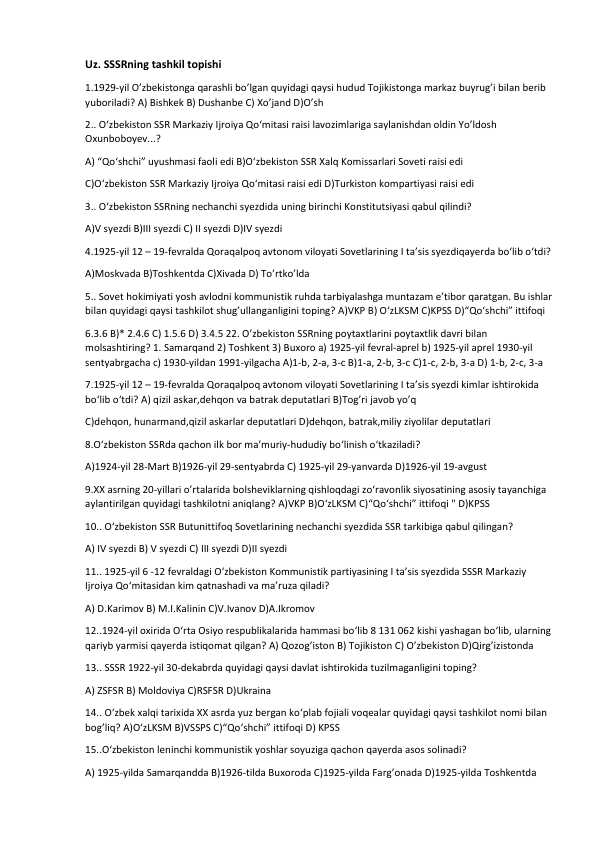O'zb. SSSRning tashkil topishi (test 15ta javobli)