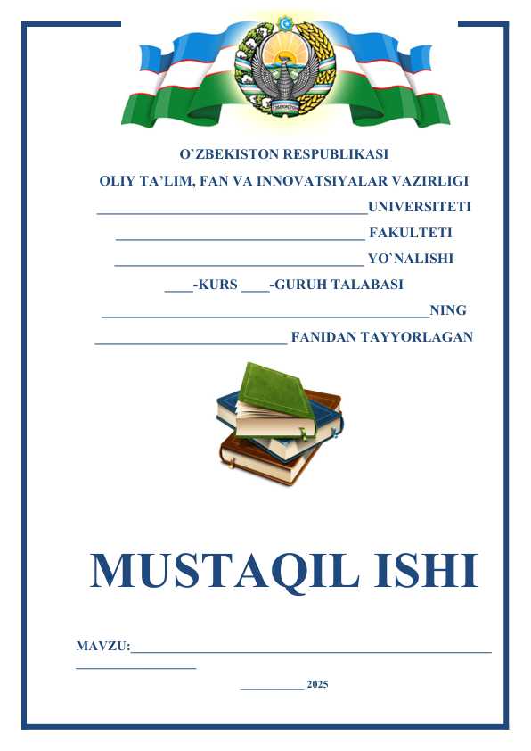 TaqdimotlarKurs ishlariMustaqil ishlarDiplom ishlariBlankalarBiznes rejalarElektron kitoblarStatistikaMaqolaPlakatlarLoyihalarIjodiy IshlarAmaliy ishlarDasturlash tillariNamunaviy hujjatlarO'quv qo'llanmalarTarqatma materiallarDars ishlanmalarTestlarReferatlarIxtiro patentiDissertatsiya ishlariLabaratoriya Ishlari