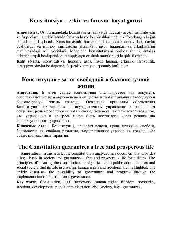 Yangi tahrirdagi O’zbekiston Respublikasi Konstitutsiyasida Fuqarolik jamiyati institutlari faoliyatining kafolatlanishi