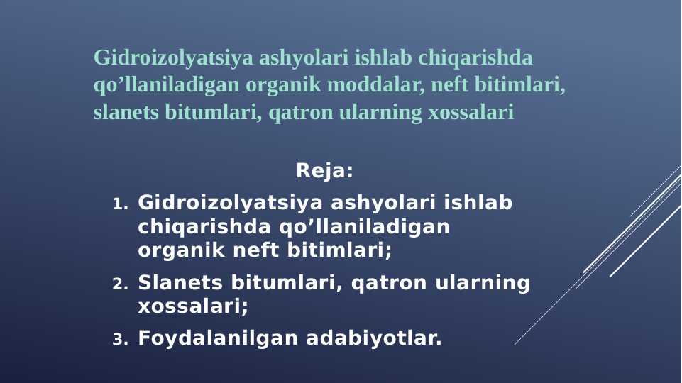 TaqdimotlarKurs ishlariMustaqil ishlarDiplom ishlariBlankalarBiznes rejalarElektron kitoblarStatistikaMaqolaPlakatlarLoyihalarIjodiy IshlarAmaliy ishlarDasturlash tillariNamunaviy hujjatlarO'quv qo'llanmalarTarqatma materiallarDars ishlanmalarTestlarReferatlarIxtiro patentiDissertatsiya ishlariLabaratoriya Ishlari