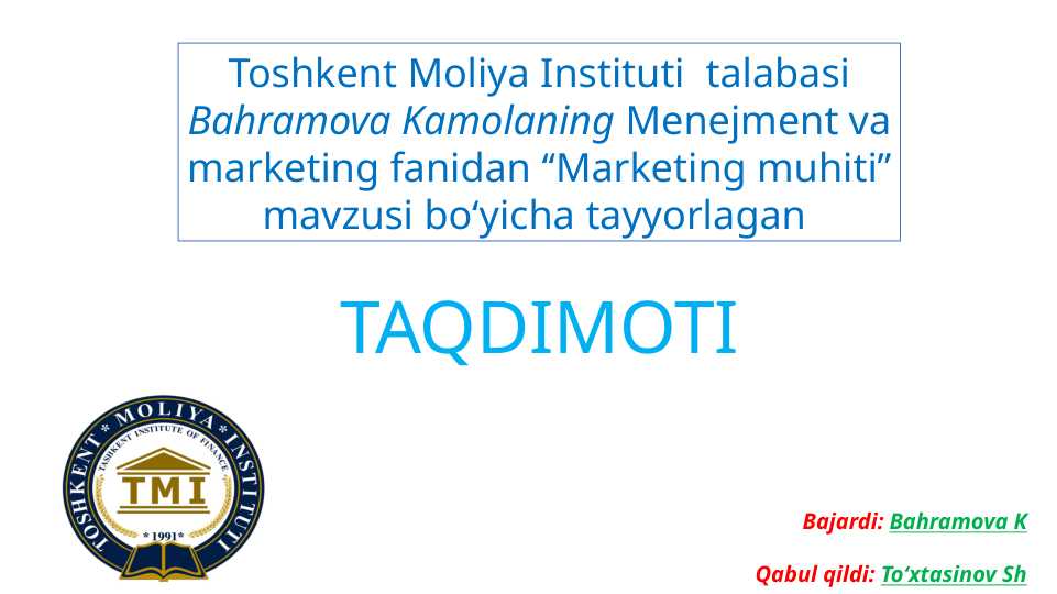 TaqdimotlarKurs ishlariMustaqil ishlarDiplom ishlariBlankalarBiznes rejalarElektron kitoblarStatistikaMaqolaPlakatlarLoyihalarIjodiy IshlarAmaliy ishlarDasturlash tillariNamunaviy hujjatlarO'quv qo'llanmalarTarqatma materiallarDars ishlanmalarTestlarReferatlarIxtiro patentiDissertatsiya ishlariLabaratoriya Ishlari