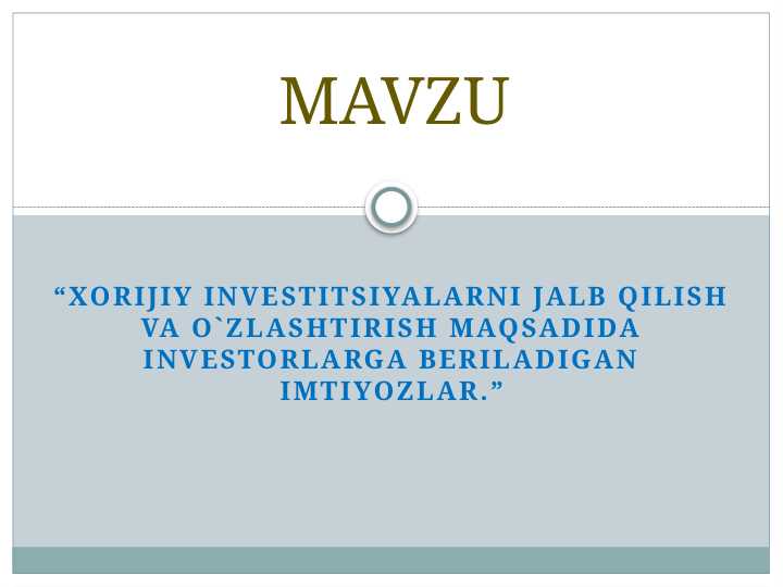 Xorijiy investitsiyalarni jalb qilish va o`zlashtirish maqsadida investorlarga beriladigan imtiyozlar 2016