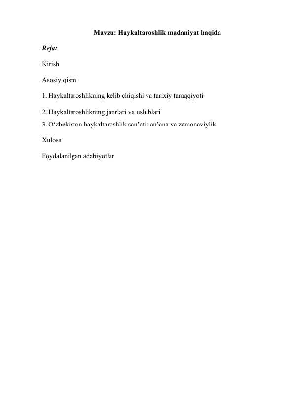 TaqdimotlarKurs ishlariMustaqil ishlarDiplom ishlariBlankalarBiznes rejalarElektron kitoblarStatistikaMaqolaPlakatlarLoyihalarIjodiy IshlarAmaliy ishlarDasturlash tillariNamunaviy hujjatlarO'quv qo'llanmalarTarqatma materiallarDars ishlanmalarTestlarReferatlarIxtiro patentiDissertatsiya ishlariLabaratoriya Ishlari