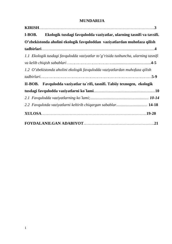 Ekologik tusdagi favqulodda vaziyatlar, ularning tasnifi va tavsifi. O’zbеkistonda aholini ekologik favquloddan vaziyatlardan muhofaza qilish tadbirlari