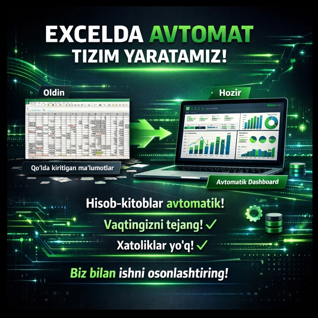 Excel avtomatlashtirish xizmati korxona va shaxsiy faoliyatdagi hisob-kitob jarayonlarini soddalashtirish va tezlashtirishga qaratilgan. Xizmat doirasida turli murakkab jarayonlar uchun avtomatlashtirilgan jadvallar va tizimlar yaratiladi. Formulalar, funksiyalar va logik bog‘lanishlar orqali ma’lumotlar avtomatik qayta ishlanadi. Hisobotlar, dashboard va tahliliy jadvallar zamonaviy ko‘rinishda ishlab chiqiladi. Bu esa inson omili bilan bog‘liq xatoliklarni kamaytiradi va vaqtni tejaydi. Har bir loyiha mijoz ehtiyojiga mos ravishda individual tarzda ishlab chiqiladi. Tizimlar foydalanishga qulay va tushunarli shaklda taqdim etiladi. Natijada ish samaradorligi oshadi va boshqaruv jarayonlari osonlashadi. Tayyor loyiha belgilangan muddatda topshiriladi. Zaruratga ko‘ra qo‘llab-quvvatlash va tuzatishlar ham taqdim etiladi.