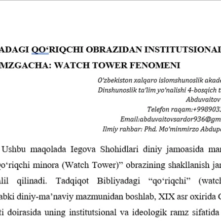 Diniy-ma'rifiy va boshqa ijtimoiy yo'nalishlarda tezis va maqolalar. Xalqaro va milliy standartlarga amal qilingan. Maqola yozishning barcha talablari qamrab olingan.