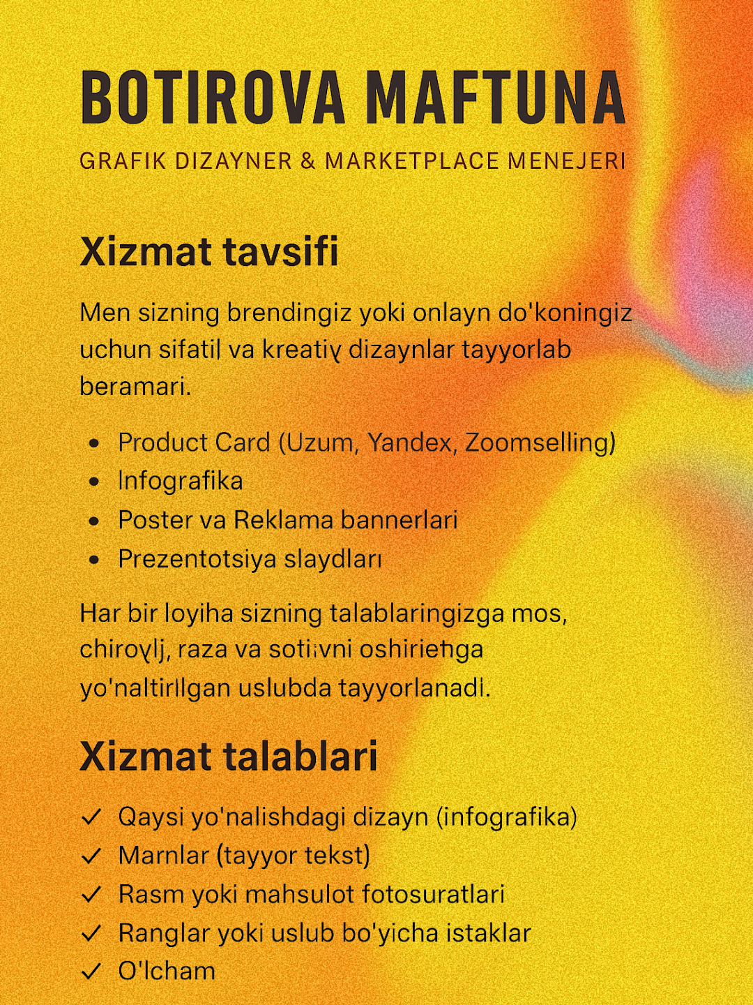 Men sizning brendingiz yoki onlayn do‘koningiz uchun sifatli va kreativ dizaynlar tayyorlab beraman.