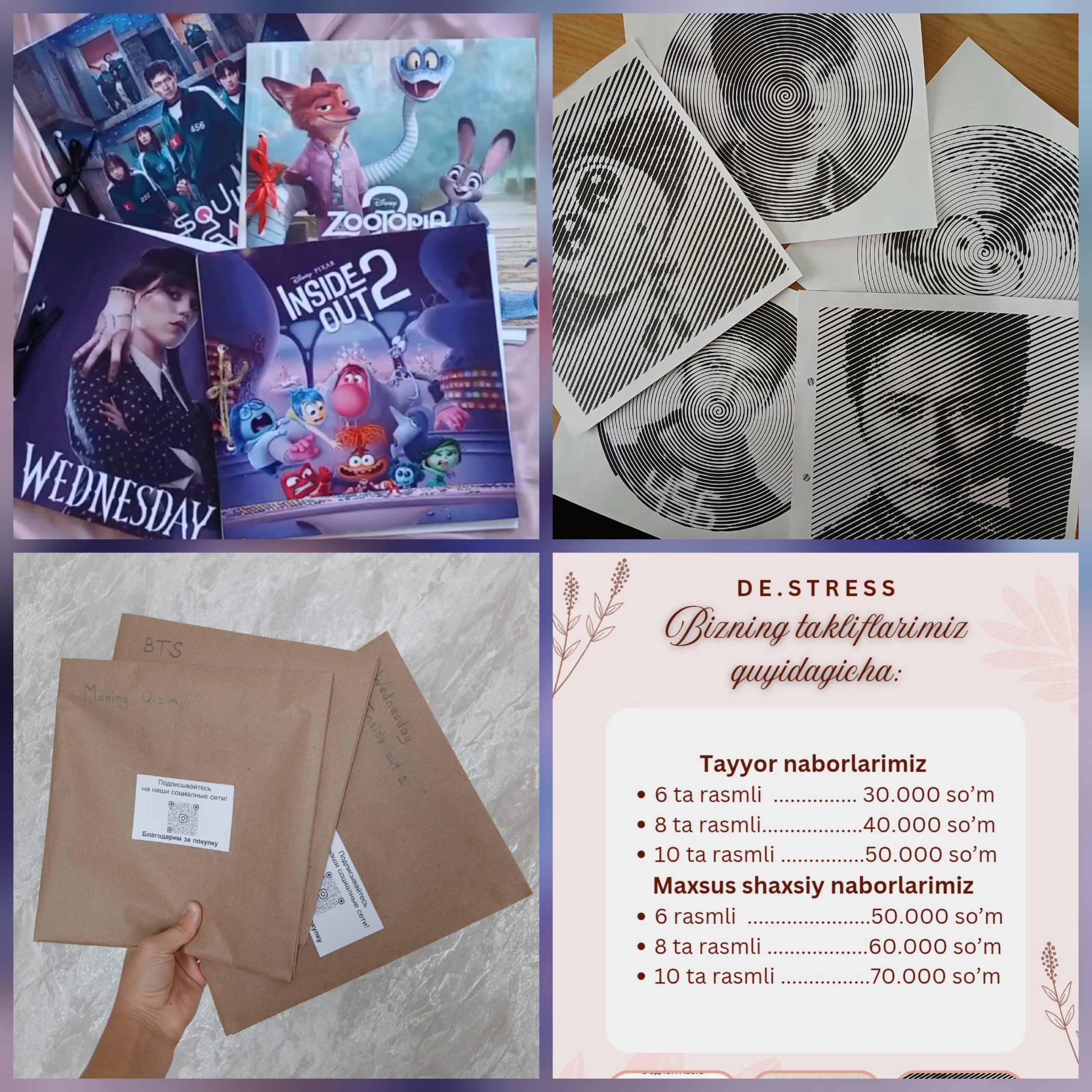 - O'zingiz istagan rasmlardan maxsus shaxsiy buyurtmalar ham olaman