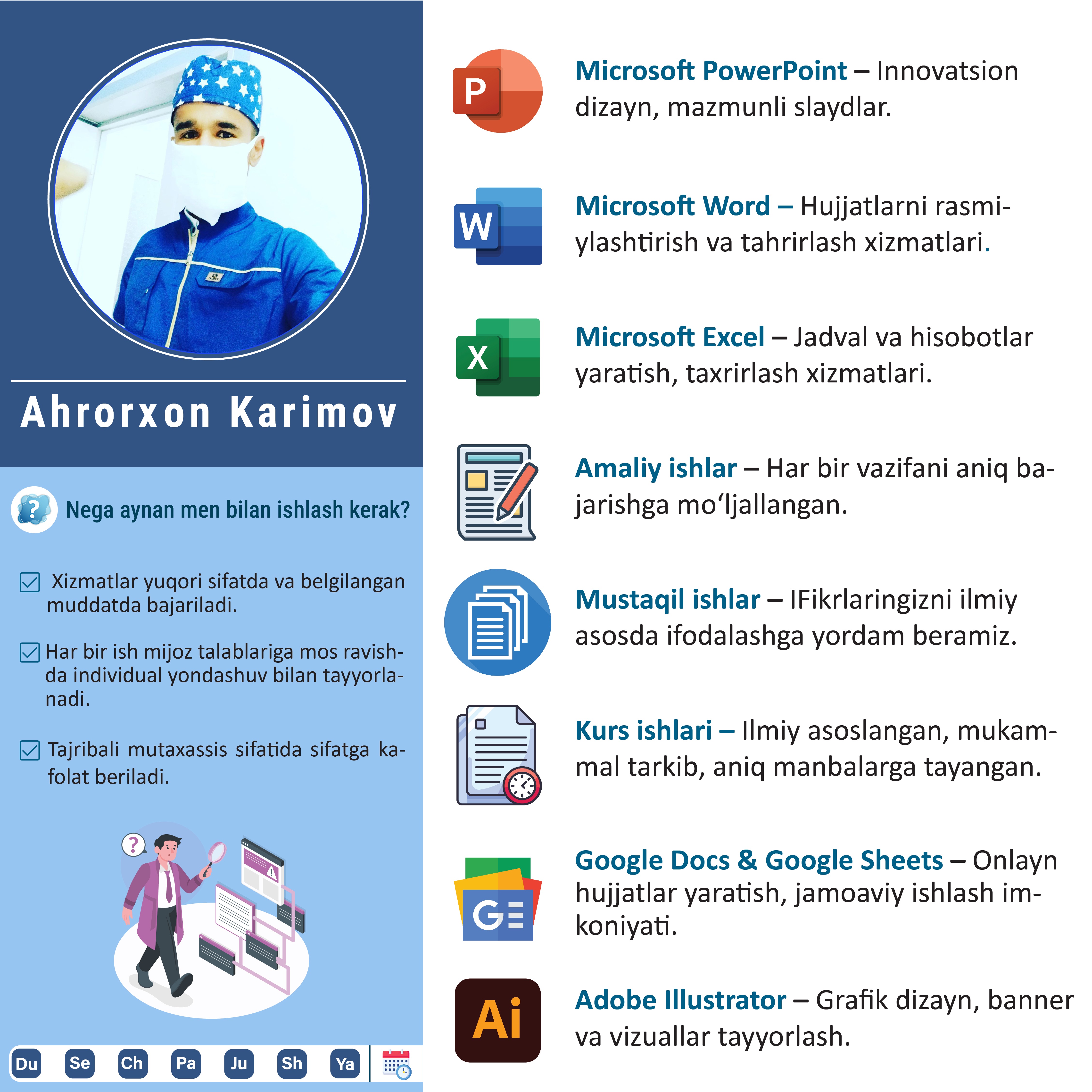 Ilmiy va o‘quviy yo‘nalishlarda maqolalar tayyorlash xizmati. Har bir maqola mavzuga mos, ilmiy-uslubiy talablar asosida va adabiyotlar bilan boyitilgan tarzda yoziladi.