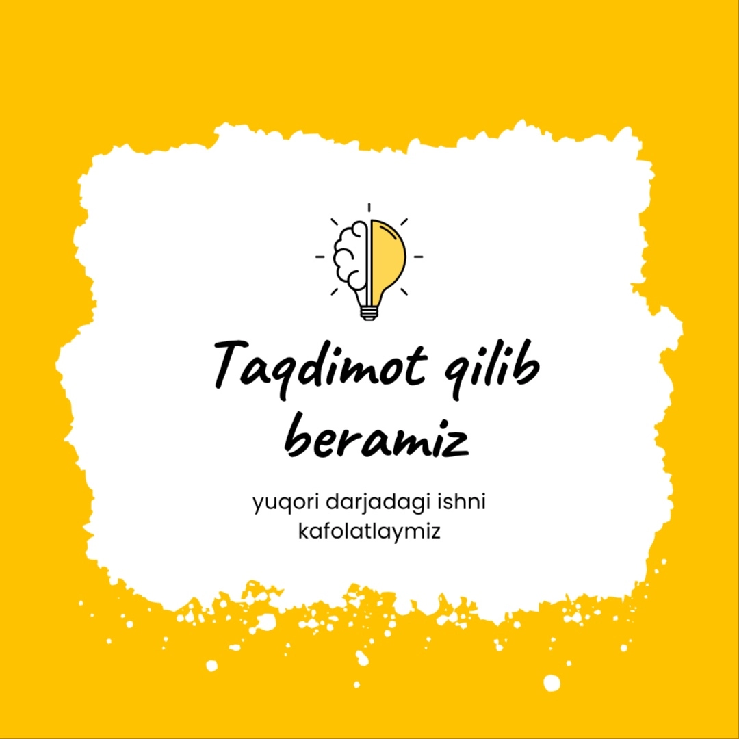 ✏️ 1. Qayta tahrir va to‘ldirish – Mavjud matn yoki slaydlarni yangilash, mazmunini boyitish, xatolarni to‘g‘rilash va uslubni yaxshilash. 📚 2. Matnni to‘liq yozish yoki qayta yozish – Siz bergan mavzu asosida boshidan oxirigacha yangi, original va ilmiy talabga mos ish yaratish. 🎨 3. Dizayn ishlari – Slayd, taqdimot, banner, logotip, poster va boshqa vizual materiallar uchun estetik, zamonaviy dizayn tayyorlash. 📈 4. Taqdimot tuzilmasini shakllantirish – Kirish, asosiy qism, xulosa, jadval, diagramma va rasm joylashuvini to‘g‘ri rejalashtirish. 🧾 5. Grammatik, imlo va uslubiy tahrir – Har bir matnni grammatik jihatdan toza, o‘qilishi oson va rasmiy shaklda tayyorlash. 💬 6. Formatlash va fayl tayyorlash – Ishni siz xohlagan formatda (Word, PDF, PowerPoint va boshqalar) tayyorlab, to‘liq topshirish. 🔍 7. Tekshiruv va yakuniy nazorat – Ish topshirilishidan oldin tahrir, tartib va dizayn bo‘yicha yakuniy sifat nazorati o‘tkaziladi. 🪄 8. Qo‘shimcha xizmatlar (talabga ko‘ra): – Jadval, glossariy, klaster, test savollari, infografika, rasmli kontent, animatsion effektlar qo‘shish.