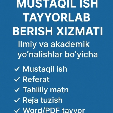 Men sizga har xil yo‘nalishlar bo‘yicha mustaqil ish, referat, taqdimot, tahliliy yozuv yoki mini-loyihani professional tarzda tayyorlab beraman.