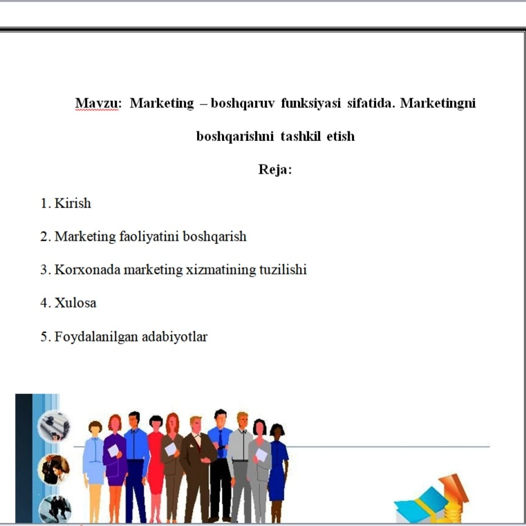 Ishni boshlashim uchun mavzu va uning talabi yetarli. Talab(necha bet ekanligi, reja shakli murakkab yoki sodda ekaligi, yozuv shrifti va h.k) buyurtmachi tomonidan belgilanadi. sizga kerakli tartibda tayyorlab beraman.
