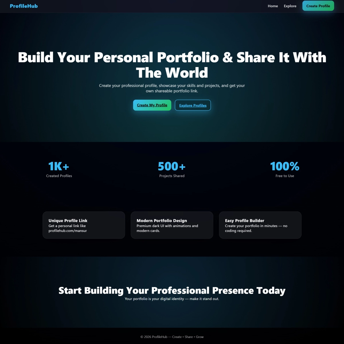 ProfileHub — bu foydalanuvchilarga o‘z shaxsiy portfolio sahifasini yaratish, loyihalarini joylash va bitta maxsus havola orqali boshqalar bilan ulashish imkonini beruvchi zamonaviy web platforma.