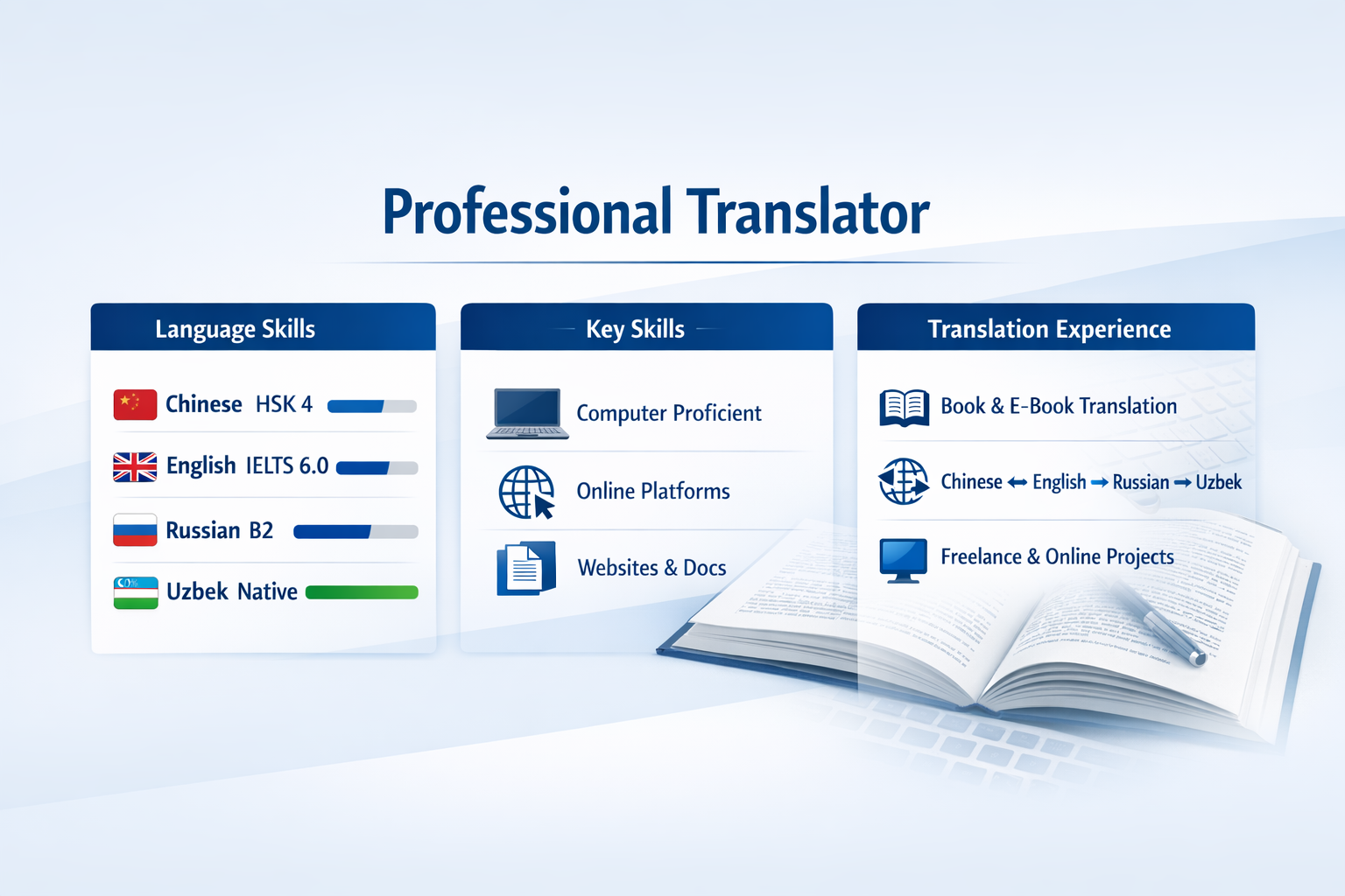 Men xitoy (Chinese), rus (Russian), ingliz (English) va o‘zbek (Uzbek) tillari o‘rtasida professional tarjima qiluvchi tarjimonman. Tarjima sohasida tajribaga egaman va turli yo‘nalishlarda ish olib borganman: akademik, biznes, texnik, kitoblar va veb-materiallar.