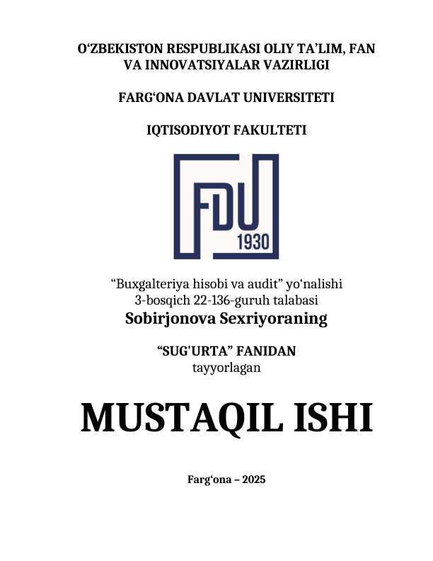 TaqdimotlarKurs ishlariMustaqil ishlarDiplom ishlariBlankalarBiznes rejalarElektron kitoblarStatistikaMaqolaPlakatlarLoyihalarIjodiy IshlarAmaliy ishlarDasturlash tillariNamunaviy hujjatlarO'quv qo'llanmalarTarqatma materiallarDars ishlanmalarTestlarReferatlarIxtiro patentiDissertatsiya ishlariLabaratoriya Ishlari