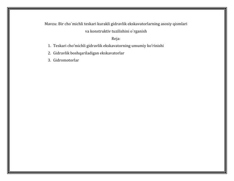 Bir cho`michli teskari kurakli gidravlik ekskavatorlarning asosiy qismlari