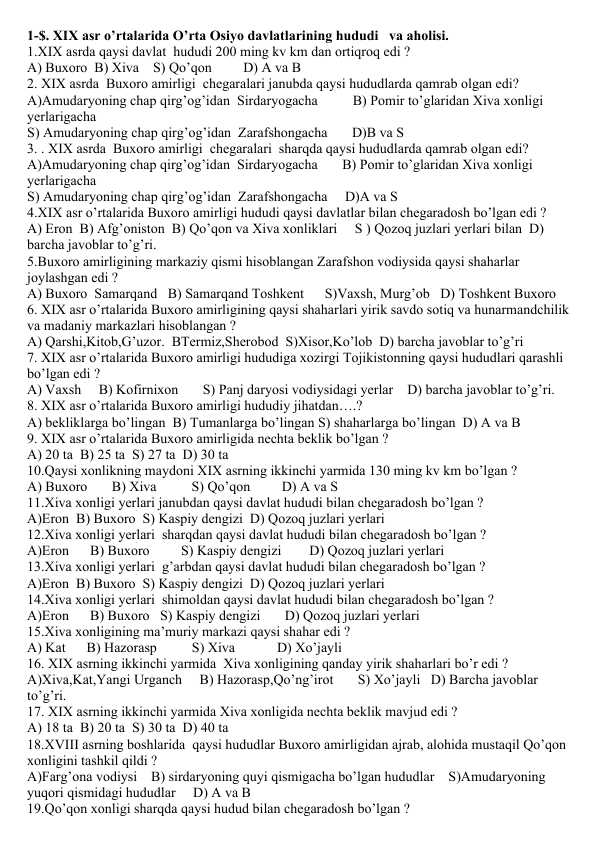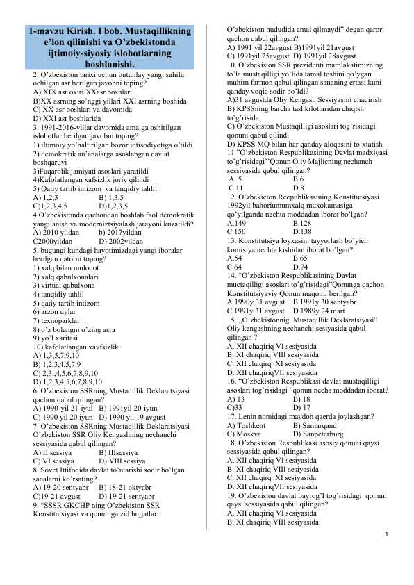 O'zbekistonning eng yangi tarixi fanidan test savollari